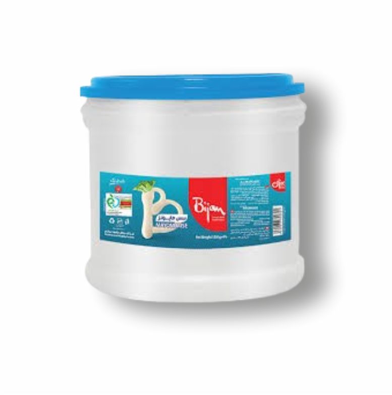 سس مایونز دبه بیژن کرمی و لطیف، با طعمی ملایم و خوشمزه، مناسب برای استفاده در ساندویچها، سالادها و دسرهای مختلف.